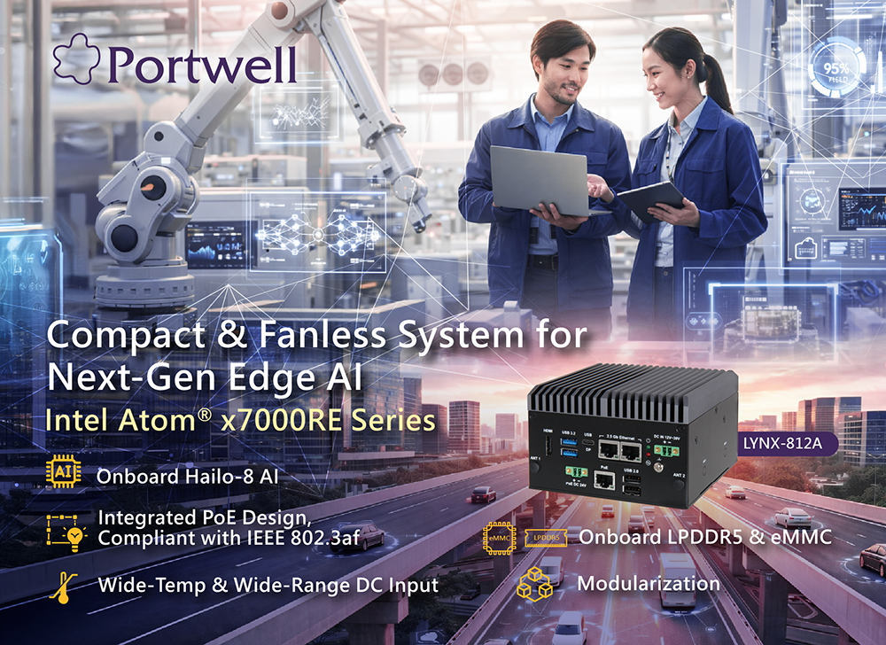 Portwell, a global innovator in industrial embedded computing solutions, announces the LYNX‑812A, a compact fanless embedded system powered by Intel® Atom™® x7000RE Series processors. Engineered for modern intelligent edge deployments, the LYNX‑812A integrates energy‑efficient processing, built‑in AI acceleration, and industrial‑grade reliability in a compact footprint. As organizations across industries expand real‑time analytics, distributed AI workloads, and edge‑driven automation, the LYNX‑812A offers a scalable and dependable platform that supports seamless OT‑IT convergence at the edge..