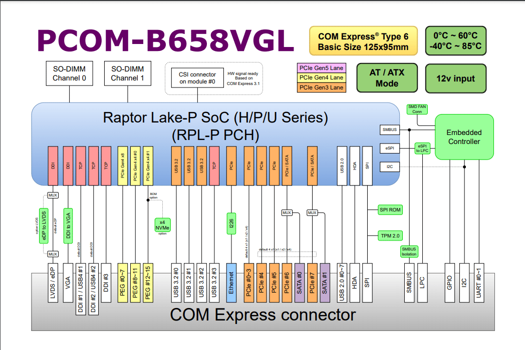 PCOM-B658VGL is COM Express module based on Intel® 13th Gen H platform. It is compatible with COM Express Rev3.1 standard. The platform adopts Intel 7 lithography and VNNI instruction set, offers advance computing power with 15~45W thermal and embedded use condition for wide range application. PCOM-B658VGL supports PCIe Gen4 lanes, and 2x Non-ECC DDR5 SO-DIMM, which is suit for mission critical use conditions and AI edge computing. This module also provides (up to) 8x PCIe Gen3 x1 lanes, 2x optional USB4(alternative with DDI), 4x USB 3.2 Gen 2, and 2x SATA III. The complete and flexible I/O capacity also mapped to wide range of embedded/industrial applications.