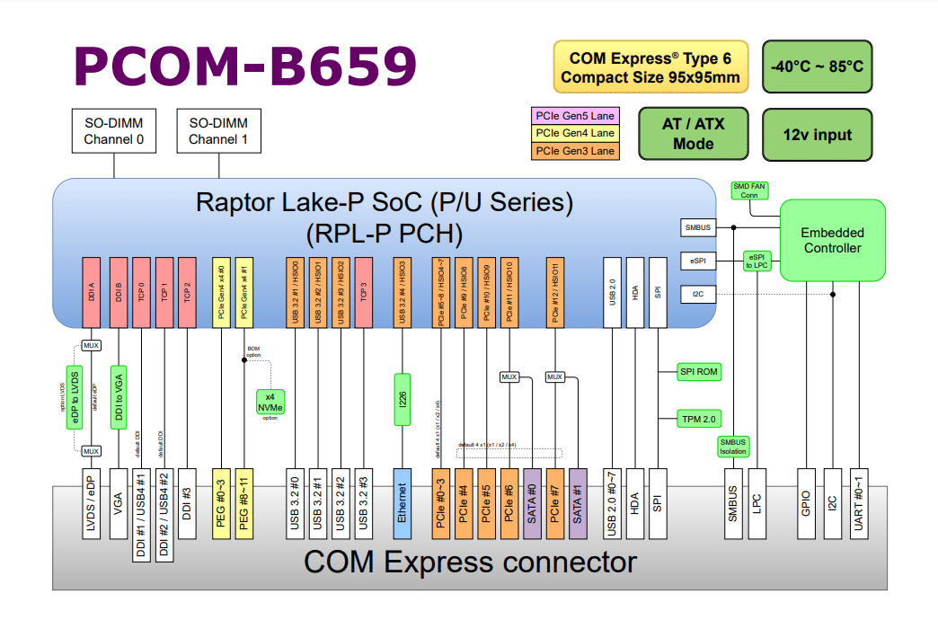PCOM-B659 is COM Express module based on Intel® 13th Gen P/U platform. It is compatible with COM Express Rev3.1 standard. The platform adopt Intel 7 lithography and VNNI instruction set, offers advance computing power with 15~28W thermal and embedded use condition for wide range application. PCOM-B659 supports PCIe Gen4 lanes, and 2x Non-ECC DDR5 SO-DIMM, which is suit for mission critical use conditions and AI edge computing. This module also provides (up to) 8x PCIe Gen3 x1 lanes, 2x optional USB4(alternative with DDI), 4x USB 3.2 Gen 2, and 2x SATA . The complete and flexible I/O capacity also mapped to wide range of embedded/industrial applications.