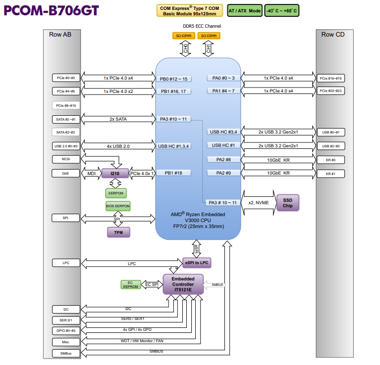 PCOM-B706GT is a Type 7 COM Express® basic size (125mm x 95mm) module based on the AMD® Embedded Ryzen™ V3000 CPU family. It provides up to 8 cores and 16 threads processors with cTDP from 10W to 54W, and 2x 10G KR/SFI ports which can support both SFP+ and RJ45 (via external PHY). The module delivers PCIe Gen4 lanes with a 16.0 GT/s transfer rate to meet the demands of throughput on different applications. The PCOM-B706GT offers 14x PCIe lanes, 4x USB 3.2 Gen2, and 2x SATA III ports, fully compliant with COM Express Type 7 specifications. Additionally, it integrates an on-module high-speed SSD storage chip for compact embedded systems with security requirements. A selected SKU (V3C18I) supports a wide temperature range while maintaining powerful computing performance with 8 cores / 16 threads, making it ideal for critical edge applications. The PCOM-B706GT provides a seamless upgrade path for compute-intensive tasks such as software-defined networking, edge computing, automation, military, and transportation systems.