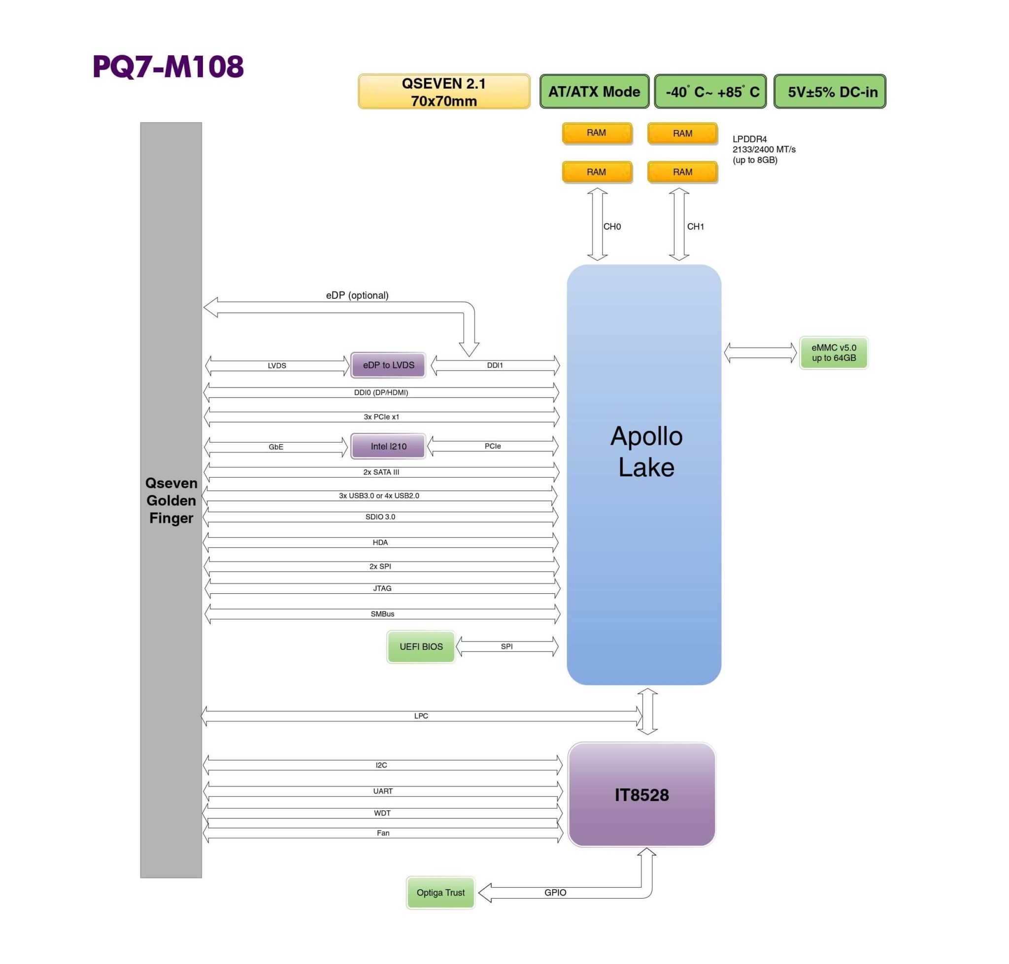 PQ7-M108 is designed with Intel® Atom®/ Pentium®/ Celeron® processors (Apollo Lake) which featured with higher graphic performance and wider memory bandwidth than the previous platform.