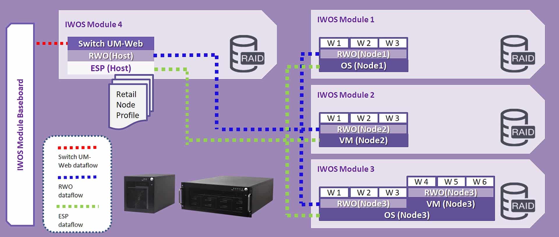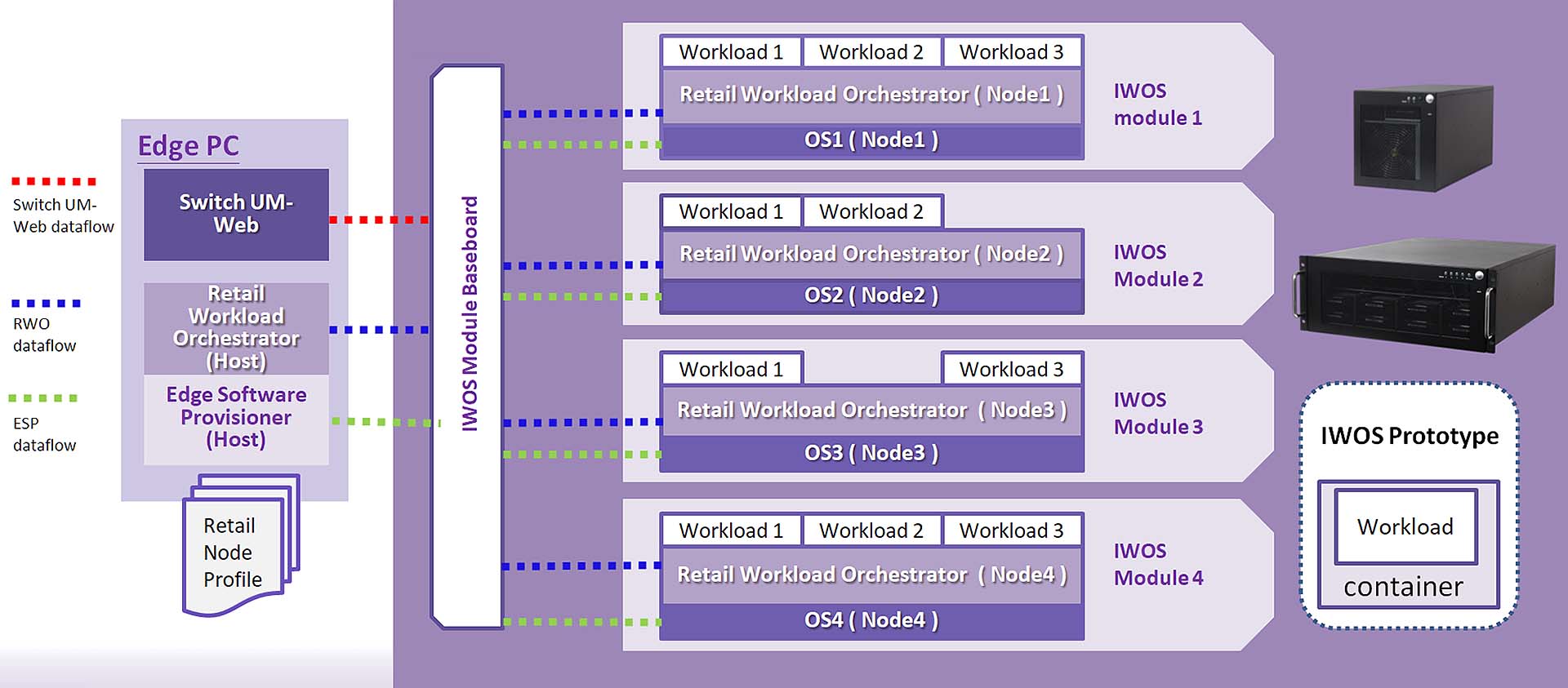Portwell IWOS system provides the easy manageability of multiple workloads in a centralized system. By using various MEC Arch modules as nodes sharing resources, each one is driving a specific workload.